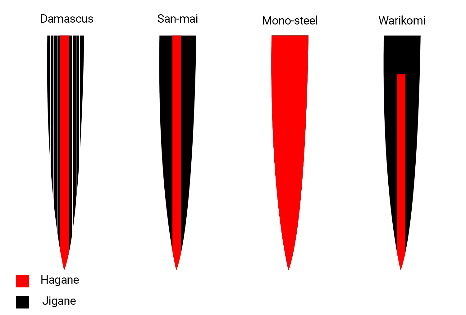 San-mai – czyli dosłownie „trzy warstwy”, gdzie stal hagane jest okuta dwiema warstwami stali jigane.