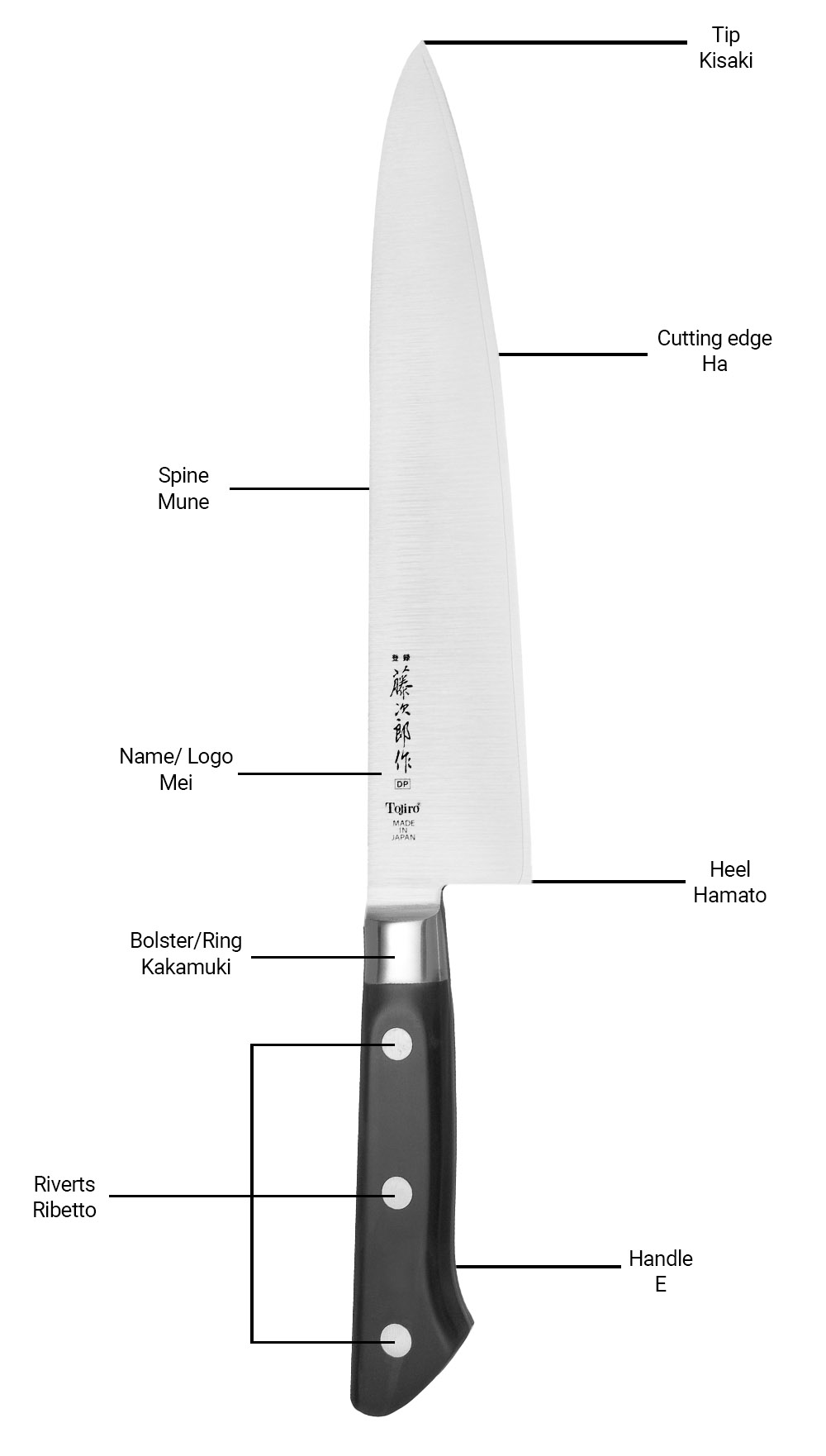 Ta historia tłumaczy, dlaczego teraz cieszymy się japońskimi nożami tworzonymi na zachodni rynek. Japończycy, jako bardzo praktyczny nardów, wypróbowali nasze europejskie noże i stwierdzili, że mogą zrobić to lepiej. Konstrukcja ostrza została wykonana całkowicie zgodnie z japońskimi metodami. Twarda stal, cienkie ostrze, znakomita geometria i ostra jak brzytwa krawędź tnąca. W ostatnich latach coraz więcej szefów kuchni korzysta z tradycyjnych japońskich rękojeści „Wa”. Ten typ rękojeści zmniejsza wagę noża i przesuwa punkt równowagi do przodu.