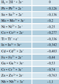 Rys. 1 Fragment szeregu napięciowego metali, jak widać żelazo ma większy potencjał elektrodowy niż cynk i chrom