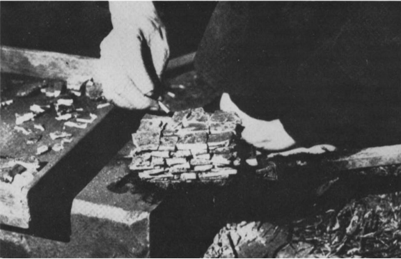 Rys.1 Prawie gotowy stosik tama hagane na płytce hera. Źródło: Dodd, B. (1978). The making of old Japanese swords. Journal of Mechanical Working Technology, 2(1), 75–84.