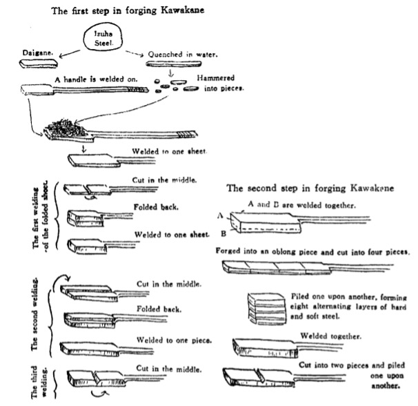 Rys. 2 Proces kucia i składania w celu wytworzenia Miecza Japońskiego, według procesu opisanego przez Chikashige, bezpośrednie tłumaczenie z języka japońskiego. Źródło: Notis, M. R. (2000). The history of the metallographic study of the Japanese sword. Materials Characterization, 45(4-5), 253–258.