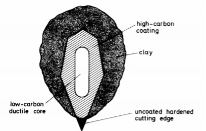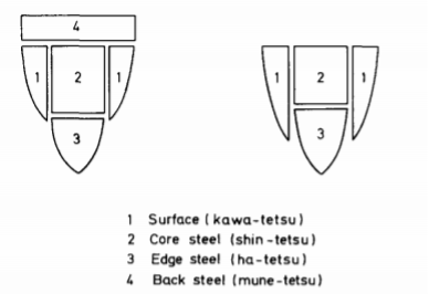 Żeby wyprodukować kompozytowy miecz (będący kompozytem metali: twardej stali wysokowęglowej i miękkiej stali nisko lub średniowęglowej) należało skuć (zespawać hutniczo) dwa typy stali. Po skuciu, połączony blok umieszczano między dwoma kowadłami i sukcesywnie zaginano do środka i zakuwano ponownie (Rys. 3). Następnie można było już wykuć miecz o właściwym, żądanym kształcie, czyniono to z niezwykłą uwagą, formowano wtedy również krzywiznę miecza zbliżoną do krzywizny końcowej. Po wszystkim powoli studzono miecz do temperatury pokojowej, tak, żeby był on jeszcze stosunkowo miękki. Niektóre dawne miecze były wykonywane nawet z czterech czy pięciu typów stali o różnym składzie, przekrój takich mieczy jest przedstawiony na Rysunku 4. Zasada produkcji była zbliżona do mieczy z dwóch rodzajów stali, były one również zakuwane w taki sam sposób. W zależności od ilości wykorzystywanych typów stali produkcja taka była bardziej czasochłonna.