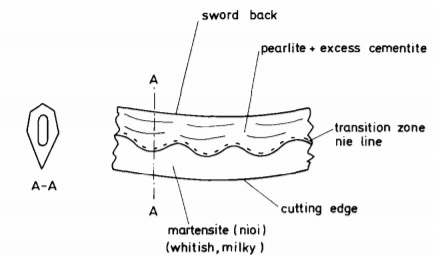 Hartowanie japońskiej katany także było niezwykłym osiągnięciem godnym nowoczesnej metalurgii i jak na tamte czasy stanowiło ewenement. Końcowy produkt musiał być niezwykle twardy na i w pobliżu krawędzi tnącej, przy zachowaniu stosunkowo miękkiego wnętrza, które gwarantowało plastyczność i odpowiednią udarność ostrza. Żeby to osiągnąć opracowano proces selektywnego hartowania. Osiągano to poprzez pokrywanie miecza grubą warstwą gliny, a następnie usunięcie jej z krawędzi ostrza i jego pobliża. Następnie miecz umieszczano w prostym piecu na węgiel drzewny, wygrzewano go w temperaturze około 800 stopni Celsjusza i chłodzono w wodzie. Glina działała jako izolacja i tylko fragment odsłonięty był chłodzony z wystarczającą prędkością, żeby austenit uległ przemianie w martenzyt na wskroś, zwykle udawało się uzyskać martenzyt również w zewnętrznych warstwach całej katany. Plastyczny rdzeń chłodził się o wiele wolniej niż krawędzie i uzyskana przez niego mikrostruktura była typową dla stali podeutektoidalnej mieszanką ferrytu podeutektoidalnego z dodatkiem perlitu. Przekrój samurajskiego miecza podczas hartowania przedstawiono na Rysunku 5.