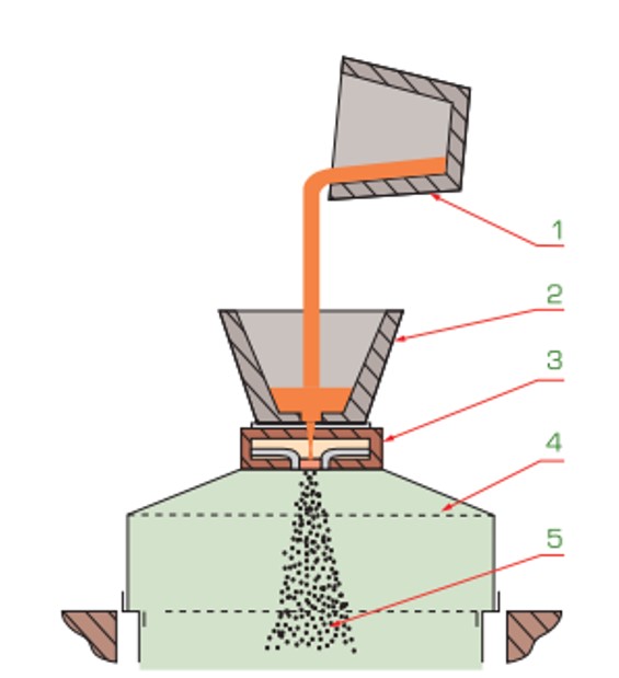 Rys.1 Schemat urządzenia do rozpylania metali: 1 – kadź, 2 –tygiel, 3 –dysza, 4 – komora rozpylania, 5 – proszek. Źródło: Dobrzański L.A., Materiały inżynierskie i projektowanie materiałowe – Podstawy nauki o materiałach i metaloznastwo, Wydawnictwa Naukowo-Techniczne, Warszawa, 2006 r.