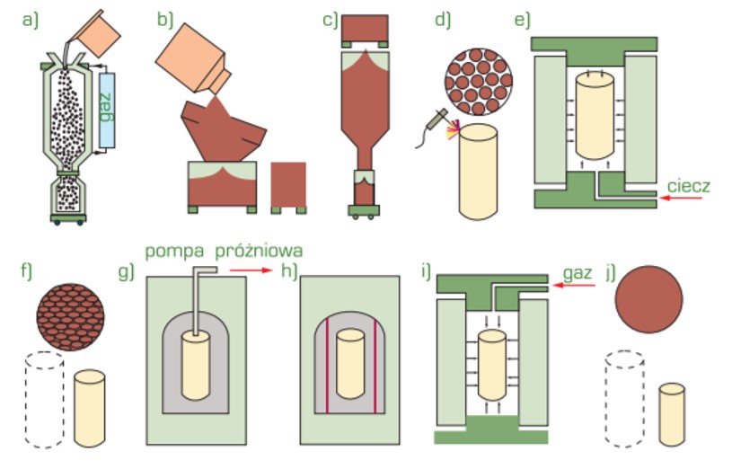 Rys.2 Przykładowy schemat procesu technologicznego procesu wytwarzania spiekanej stali szybkotnącej metodą ASP: a) rozpylanie, b) przesiewanie proszku, c) napełnianie pojemnika stalowego, d) zaspawanie pojemnika stalowego, e) prasowanie izostatyczne na zimno, f) otrzymanie bloku stali wstępnie sprasowanego, g) podgrzewanie wstępne i odgazowanie, h) podgrzewanie, i) spiekanie izostatyczne na gorąco, j) gotowy blok spiekanej stali szybkotnącej Źródło: Dobrzański L.A., Materiały inżynierskie i projektowanie materiałowe – Podstawy nauki o materiałach i metaloznastwo, Wydawnictwa Naukowo-Techniczne, Warszawa, 2006 r.