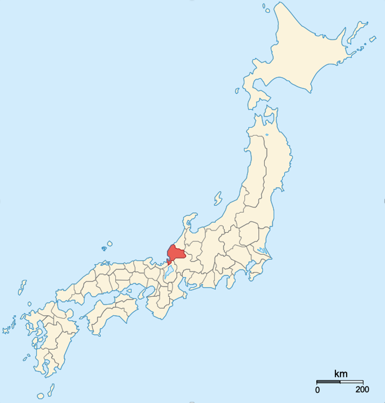Mapa Japonii z wyróżnioną prefekturą Fukui – źródło: By Ash_Crow - Own work, based on Image:Provinces of Japan.svg, CC BY 2.5, https://commons.wikimedia.org/w/index.php?curid=1655318