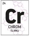 Chrom – Jest pierwiastkiem, który ma znaczący wpływ na właściwości stali. Jest podstawowym składnikiem wykorzystywanym w stalach odpornych na korozję (również żaroodpornych oraz żarowytrzymałych). W mniejszych ilościach (0,2% - 2%) jest wykorzystywany w celu poprawy hartowności. W ilościach powyżej 10,5% zapewnia stalom wysoką odporność na korozję i utlenianie (tak jak w stalach Gingami, AUS-8, ZDP-189, 420, VG 5 i 10 oraz wanadowo-molibdenowej). Jest pierwiastkiem węglikotwórczym, a więc poprawia odporność na ścieranie, twardość, a więc również odporność na zużycie. Niestety dodatek chromu wiąże się ze zmniejszeniem właściwości plastycznych jak wydłużenie i przewężenie. Pierwiastek ten zmniejsza również udarność, a więc odporność stali na obciążenie dynamiczne – np. uderzenie.