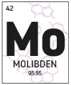 Molibden – Podobnie jak chrom ma działanie węglikotwórcze. W mniejszych ilościach do 2,5% jest stosowany w celu poprawy hartowności oraz zwiększenia twardości wtórnej (uzyskiwanej podczas odpuszczania stali po hartowaniu, związanej z przemianą austenitu szczątkowego oraz wydzieleniem nowych węglików stopowych). Zastosowanie większych ilości molibdenu (tak jak w stalach FAX 40, R -2) powoduje powstanie węglików Mo6C, co prowadzi do zwiększenia twardości, wytrzymałości i granicy plastyczności, jednakże w mniejszym stopniu niż chrom. Podobnie jak w przypadku chromu znaczne dodatki molibdenu mogą prowadzić do zmniejszenia tych właściwości plastycznych oraz udarności. Molibden zwiększa również odporność stali na korozję, zwłaszcza w obecności jonów Cl^-. Dzięki węglikom Mo2C C pierwiastek ten przy wzroście temperatury opóźnia mięknięcie stali.