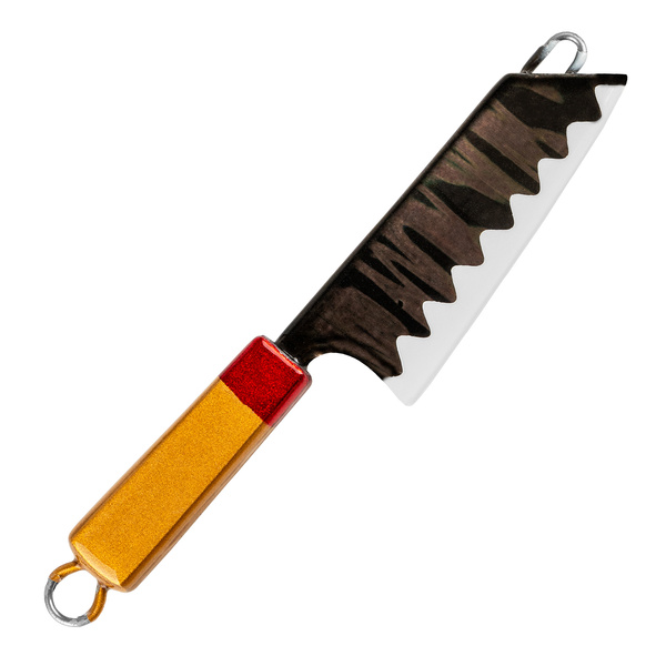 Hocho Jig w rozmiarze S to kompaktowa, metalowa przynęta wędkarska inspirowana tradycyjnym japońskim nożem hocho. Łączy w sobie funkcjonalność jiga z wyjątkowym, przyciągającym uwagę wyglądem. Idealnie sprawdza się podczas połowu mniejszych drapieżników oraz jako efektowny gadżet dla miłośników wędkarstwa.